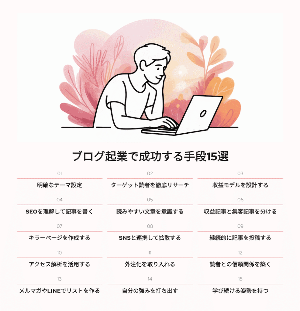 本記事では、ブログ起業で成功するための15の具体的な手段を紹介します。