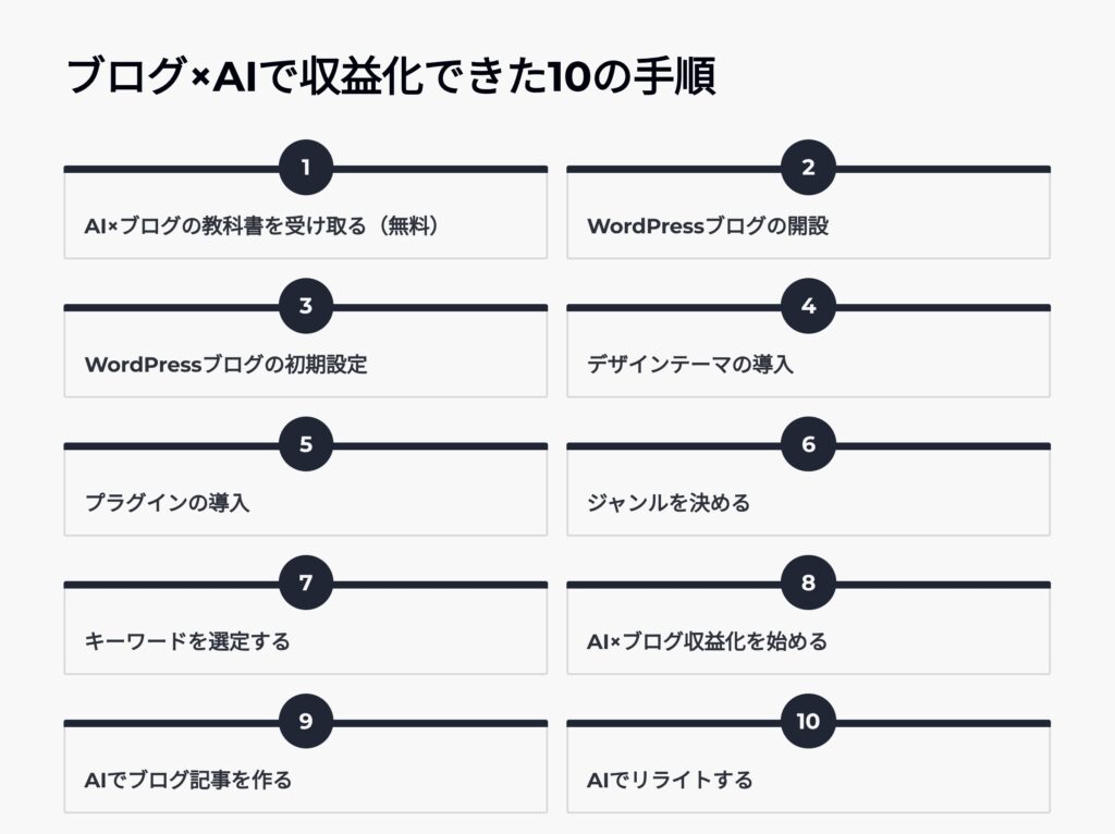 - 1.1 ブログ×AIの収益化手順①:AI×ブログの教科書を受け取る(無料)