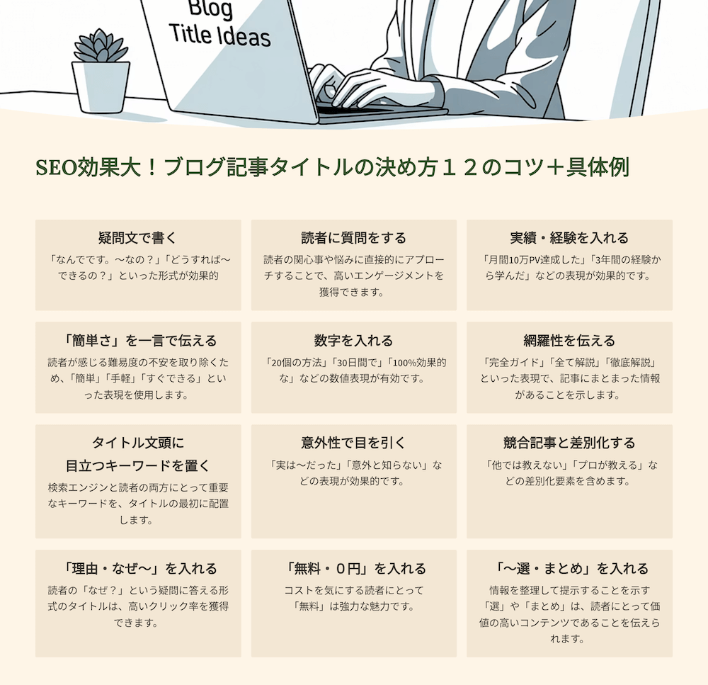 - 1 【SEO効果大】ブログ記事タイトルの決め方12のコツ+例12選
