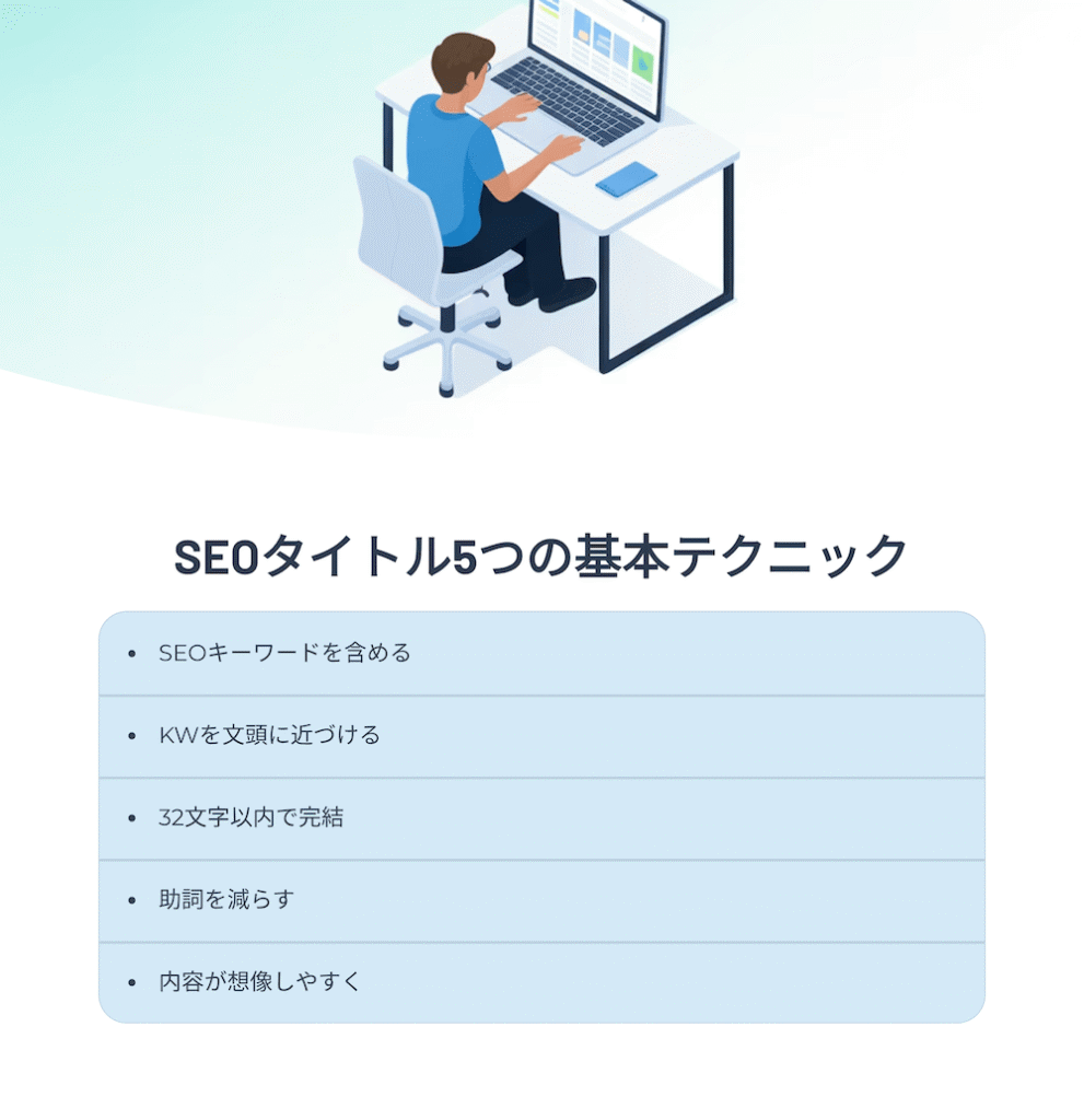 「意図の言語化+前半配置+結果の約束」で自然に強いタイトルになります。