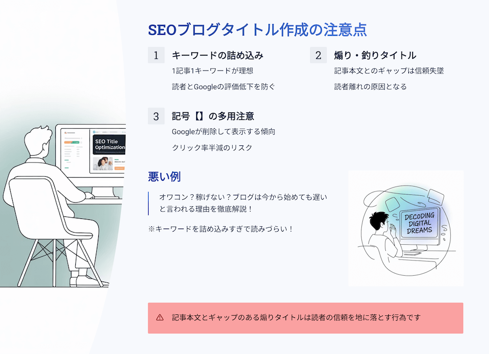 - 『ブログ 記事 タイトル 付け方×SEO|前半配置と禁則まとめ』