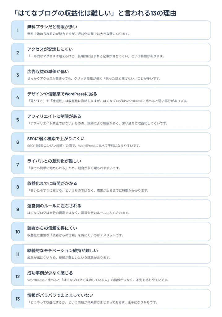 この記事では、はてなブログの収益化が難しいと言われる理由を13個に分けて解説します。