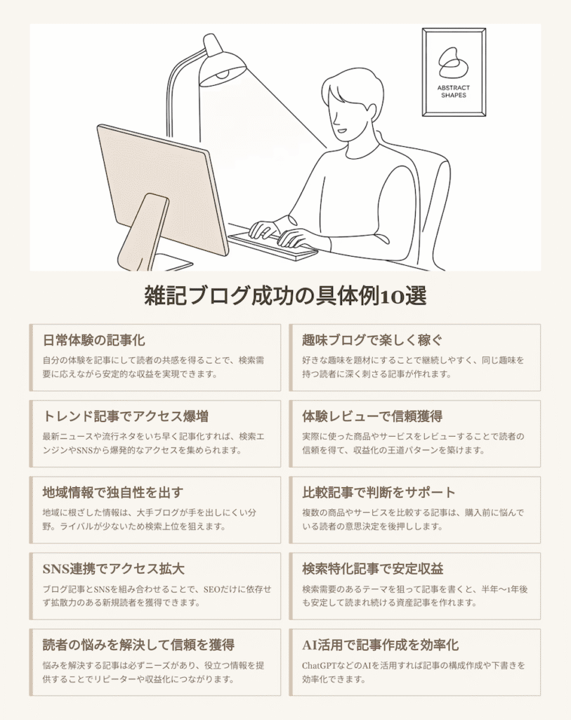 この記事では、雑記ブログ成功の具体例10選をわかりやすく紹介し、アクセスを増やすための工夫や収益化のコツを解説します。