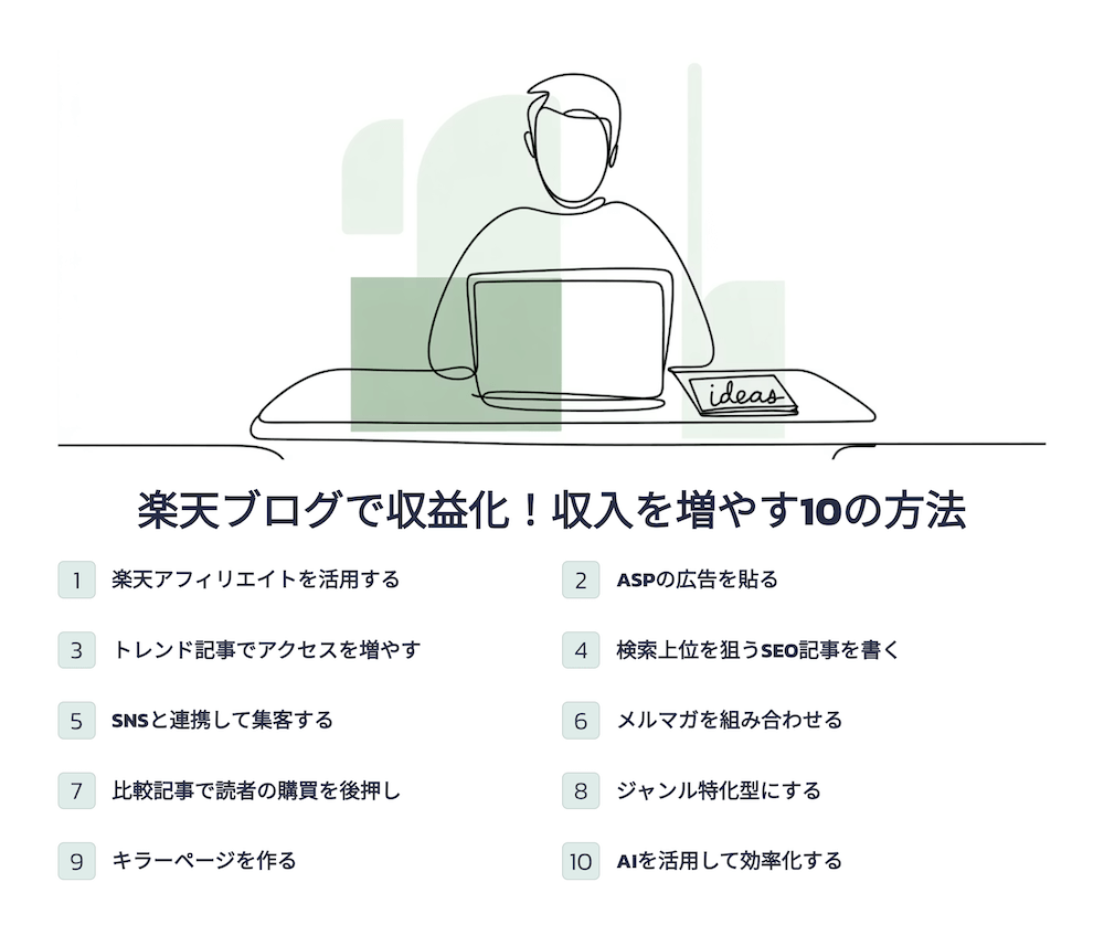 本記事では、楽天ブログを使って収益を上げる10の方法を整理しました。